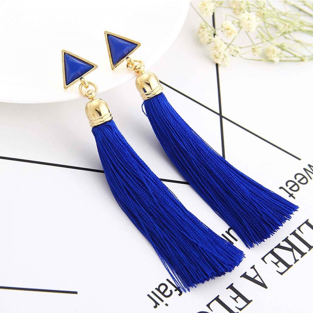 A sötétkék szín önmagában elegendő ahhoz, hogy felkeltse a figyelmet, de fülbevalóként még inkább igaz lehet ez. A hosszú bojt bohém módon ring a fülben, mintha a fülcimpa szoknyája lenne. A kék kövek teszik teljessé az ékszer megjelenését.