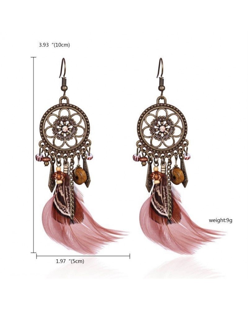 Rózsaszín bojt - Elegáns Boho toll bojt bagoly fülbevaló hosszú csehországi fülbevaló kampós levél esküvői
