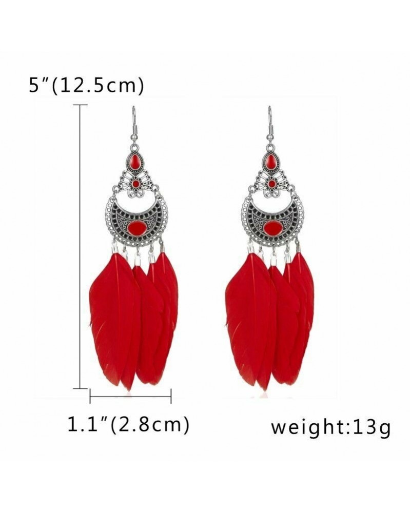Boho piros - Bájos hosszú bojt Boho etnikai tollcsepp dangle Stud fülbevaló női party ajándék