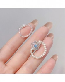 JUWANG Korean Elastic Ring Spring And Summer Style Sparkling Pearlescent Color Pearl Powder Blue Flower Ring For Women