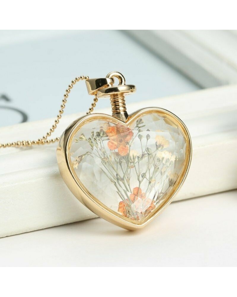 6 szív narancssárga fehér - Sikkes természetes szárított virág valódi rózsa medál nyaklánc szív üvegzsebbel nők