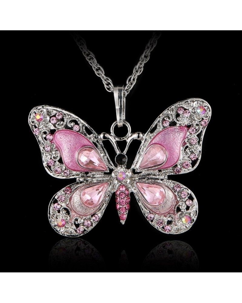 Rózsaszín - Divat strassz ötvözet kristály pillangó medál nyaklánc hosszú pulóver lánc