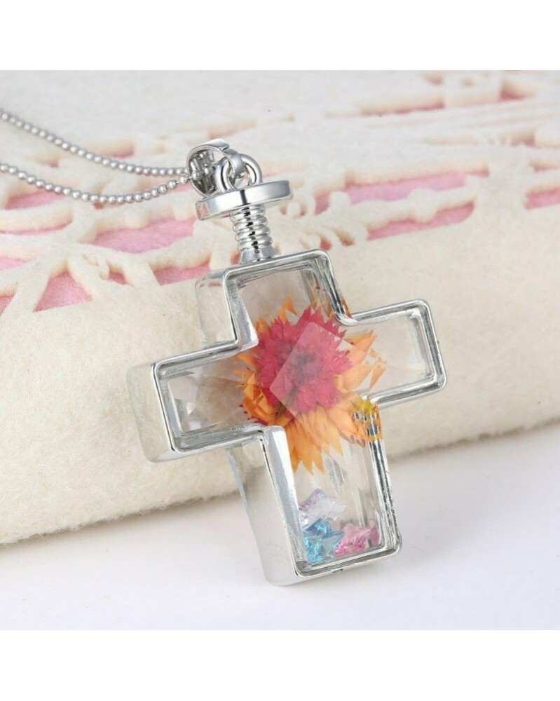 77-keresztes narancsvirág - Természetes szárított valódi rózsavirág kereszt üveg medál nyaklánc báj pulóver lánc