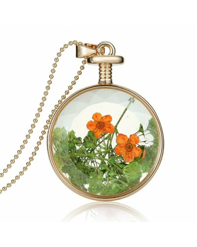 88-arany kerek-virág levél - Divat nők természetes valódi szárított virággyanta üveg nyaklánc medál ajándékot