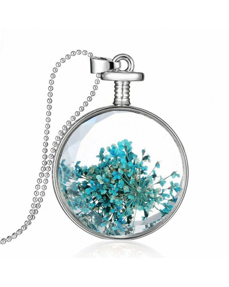 36-Ezüst kerek-kék virág - Bájos nők természetes természetes szárított virággyanta üveg medál nyakláncok