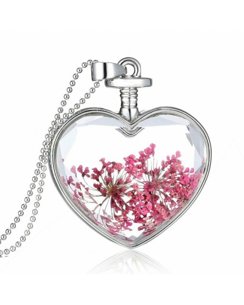 47-Ezüst szív-rózsaszín virág - Divat nők természetes valódi szárított virág üveg medál nyakláncok báj