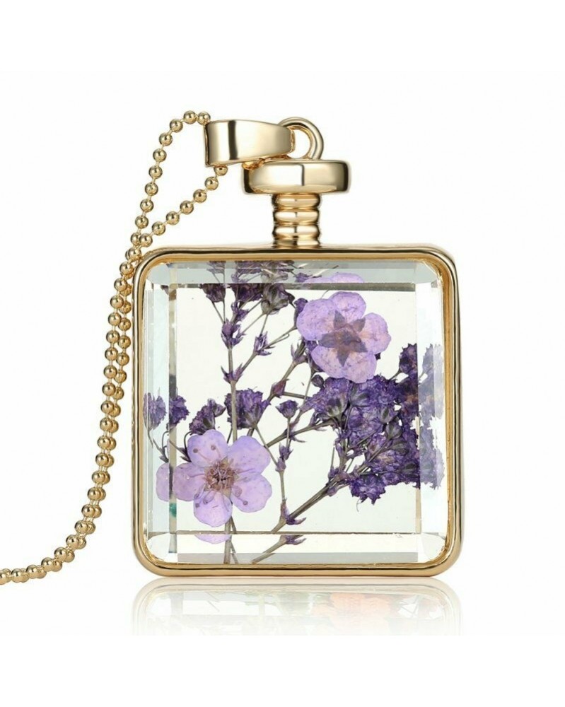 14-arany négyzet-lila virág - Divat nők természetes valódi szárított virág üveg medál nyakláncok báj ajándékokat