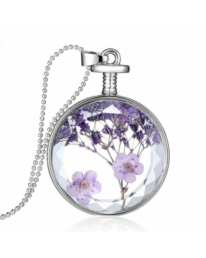 40-Ezüst kerek-lila virág - Divat nők természetes valódi szárított virág üveg medál nyakláncok báj ajándékokat