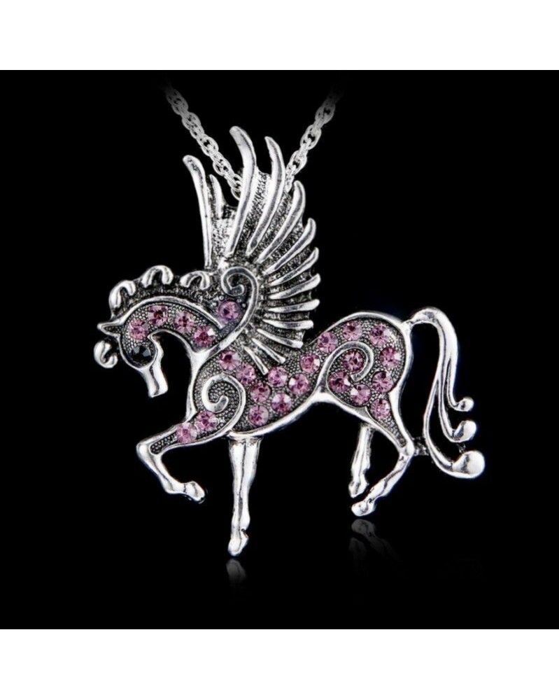 * 8-Rózsaszín kristály repülő ló - Retro női Crytal Butterfly Horse medál nyaklánc pulóver lánc ékszer ajándék