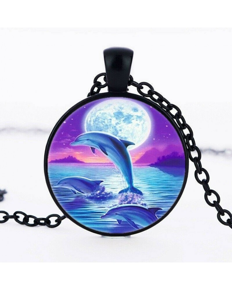 Nincs szín - Delfinek ugranak a Holdban Photo Cabochon üveg fekete lánc medál nyaklánc