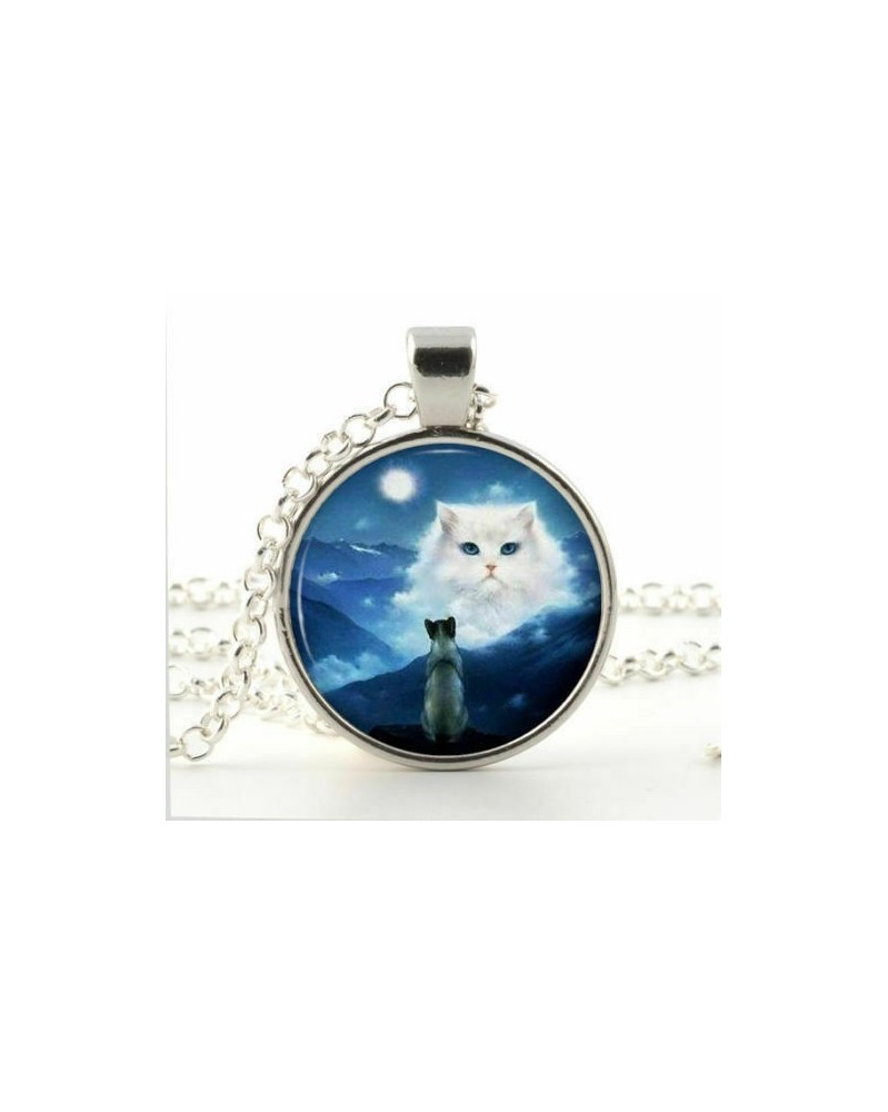 Nincs szín - Ezüst macska nyaklánc medál Fantasy fehér macska kék ég Hold kitty ékszerek