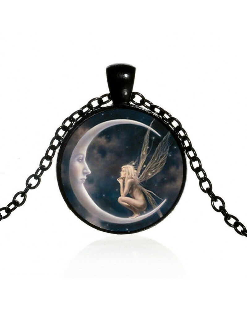 Nincs szín - Tündér a Holdon Photo Cabochon üveg ezüst lánc medál nyaklánc (fekete