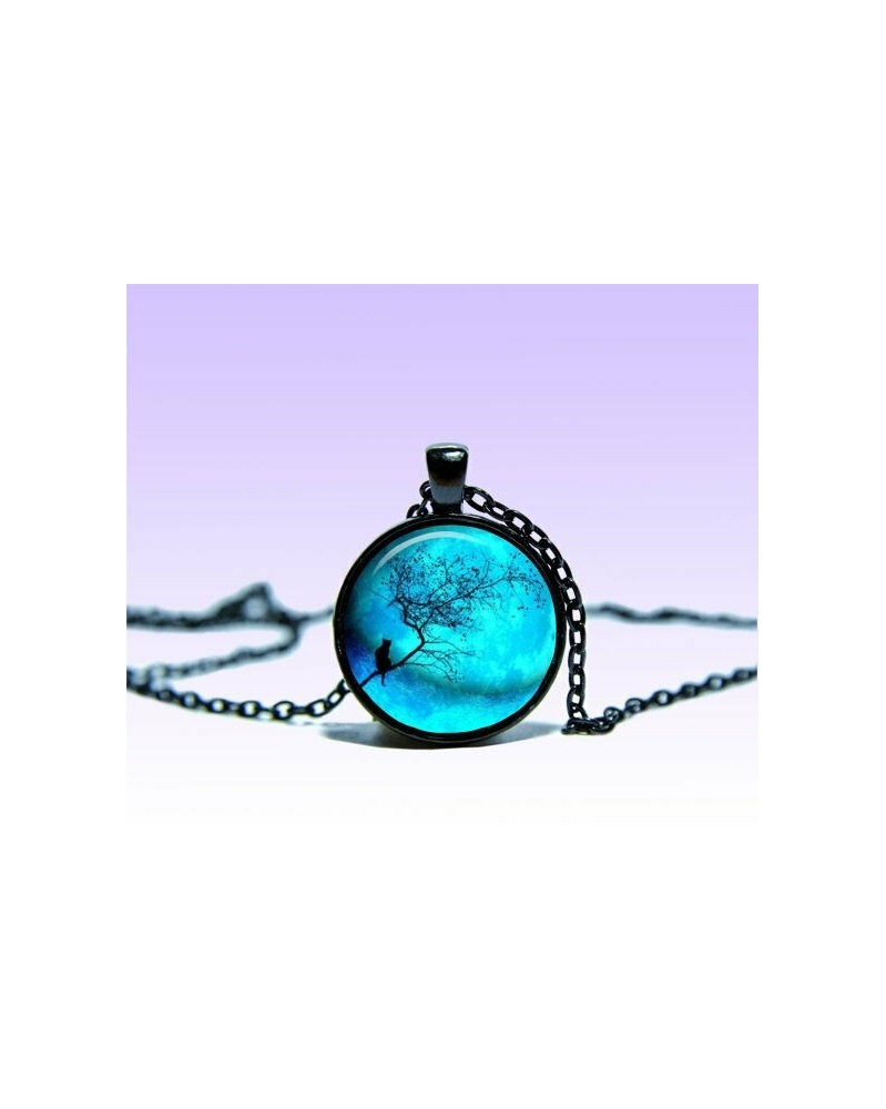 Nincs szín - Kék hold és fa macska medál bolygó fekete nyaklánc ékszer medál